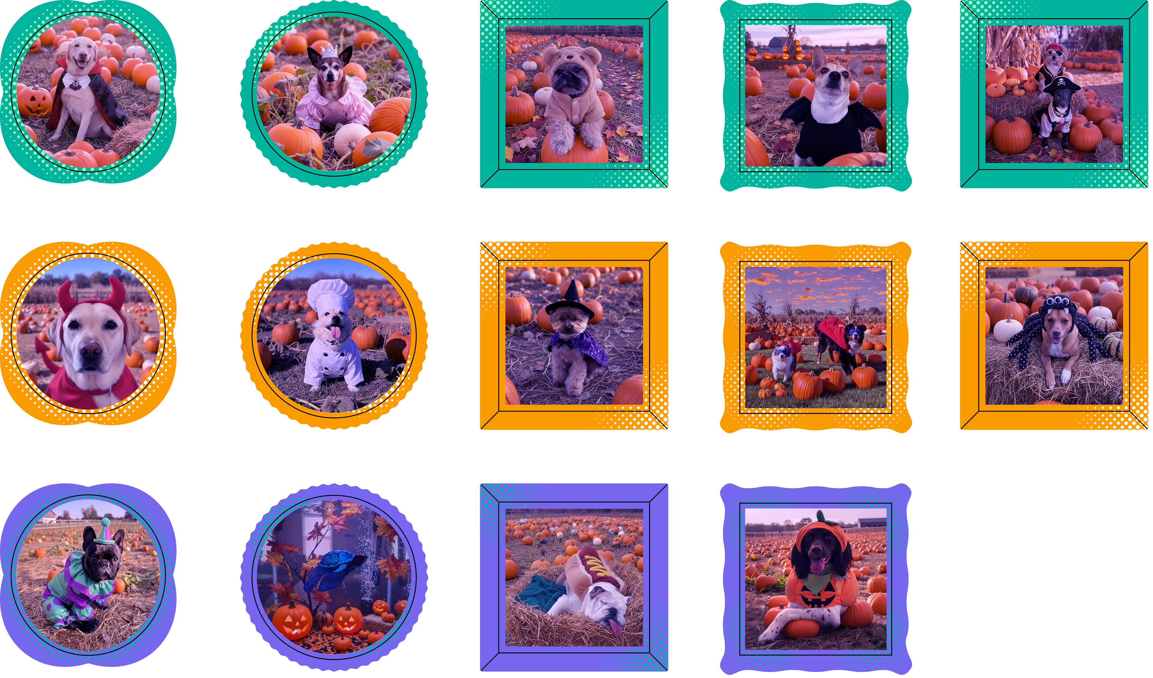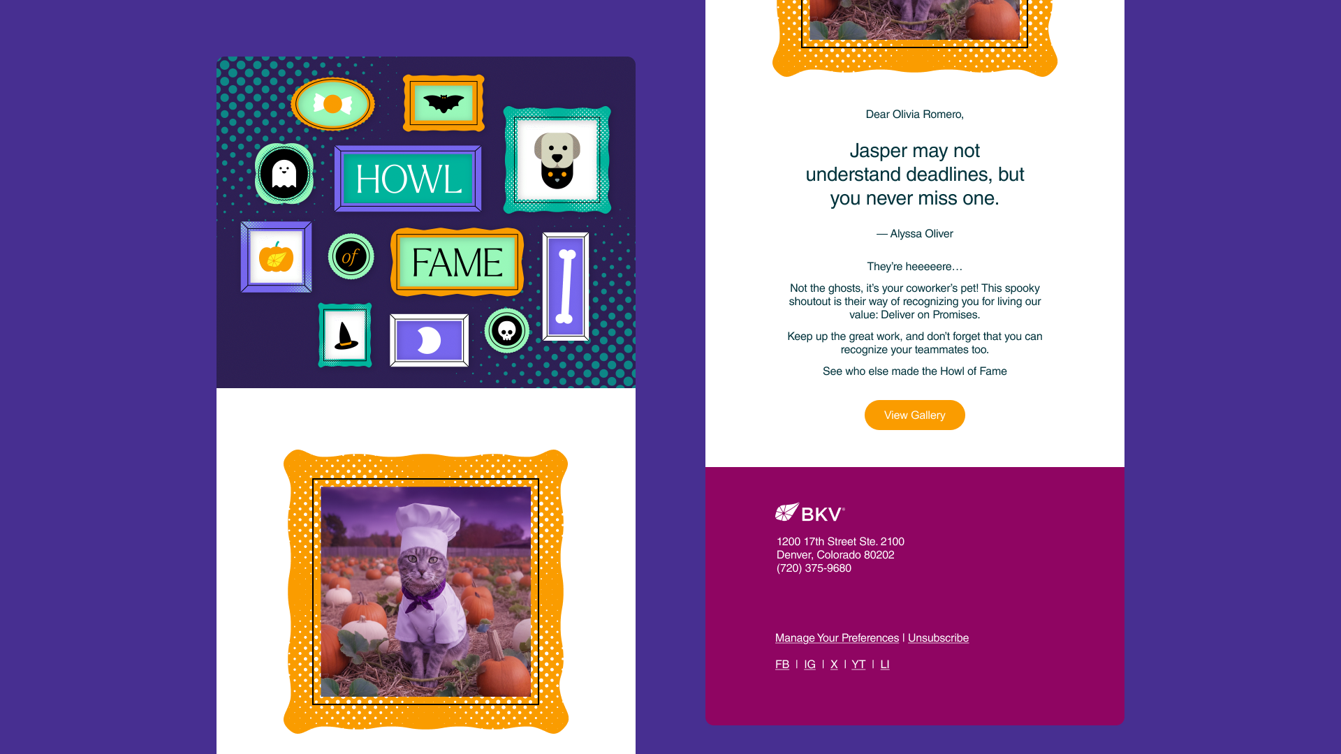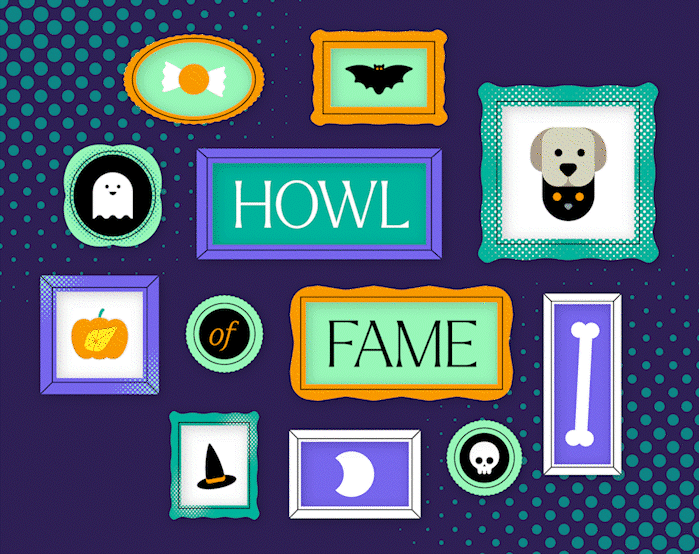 Vibrantly colored frames and simple vector illustrations and animation make up the introductory banner that flows into the rest of the special email. Then, using AI tools and standard photo manipulation techniques, employee submitted photos of pets were put into fun Halloween costumes, environments, and matching vector frames for individual delivery and celebration.
