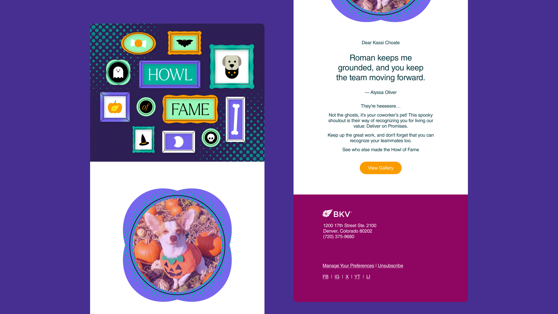 The Howl of Fame was a Halloween special event that took from the 2025 BKV Value of the Year—Deliver on Promises—and encouraged employees to nominate teammates to receive a message of appreciation as delivered by their furry (and fishy) friends.