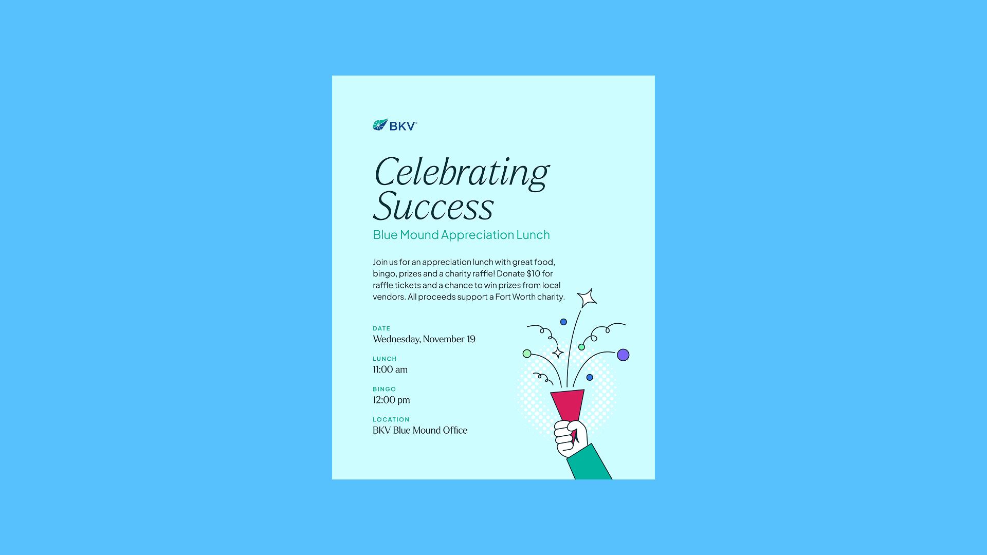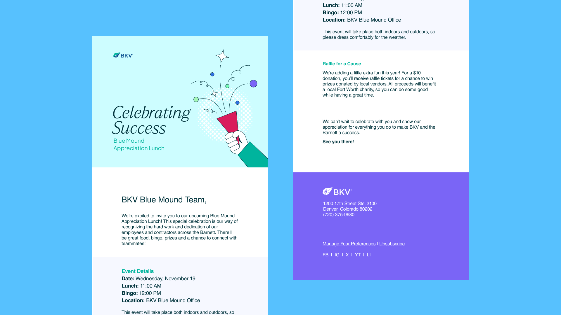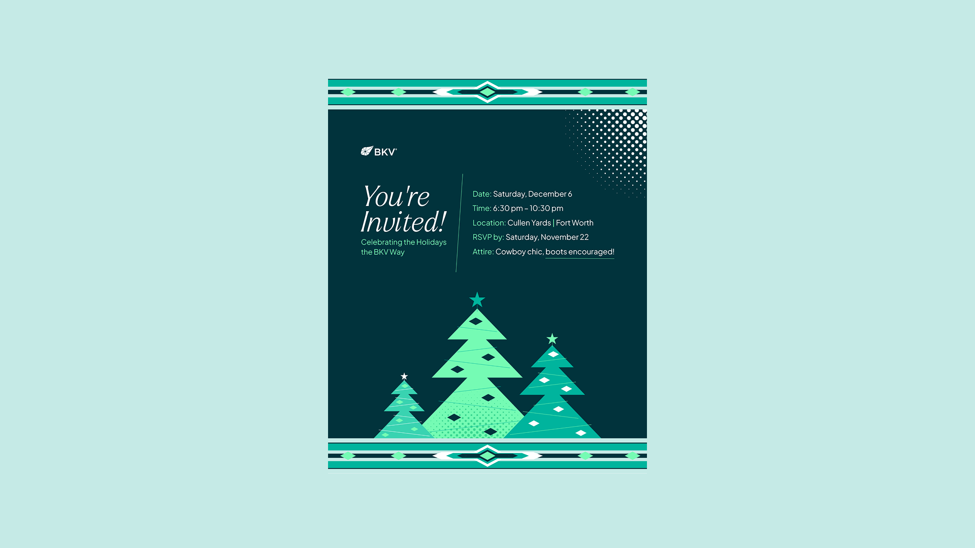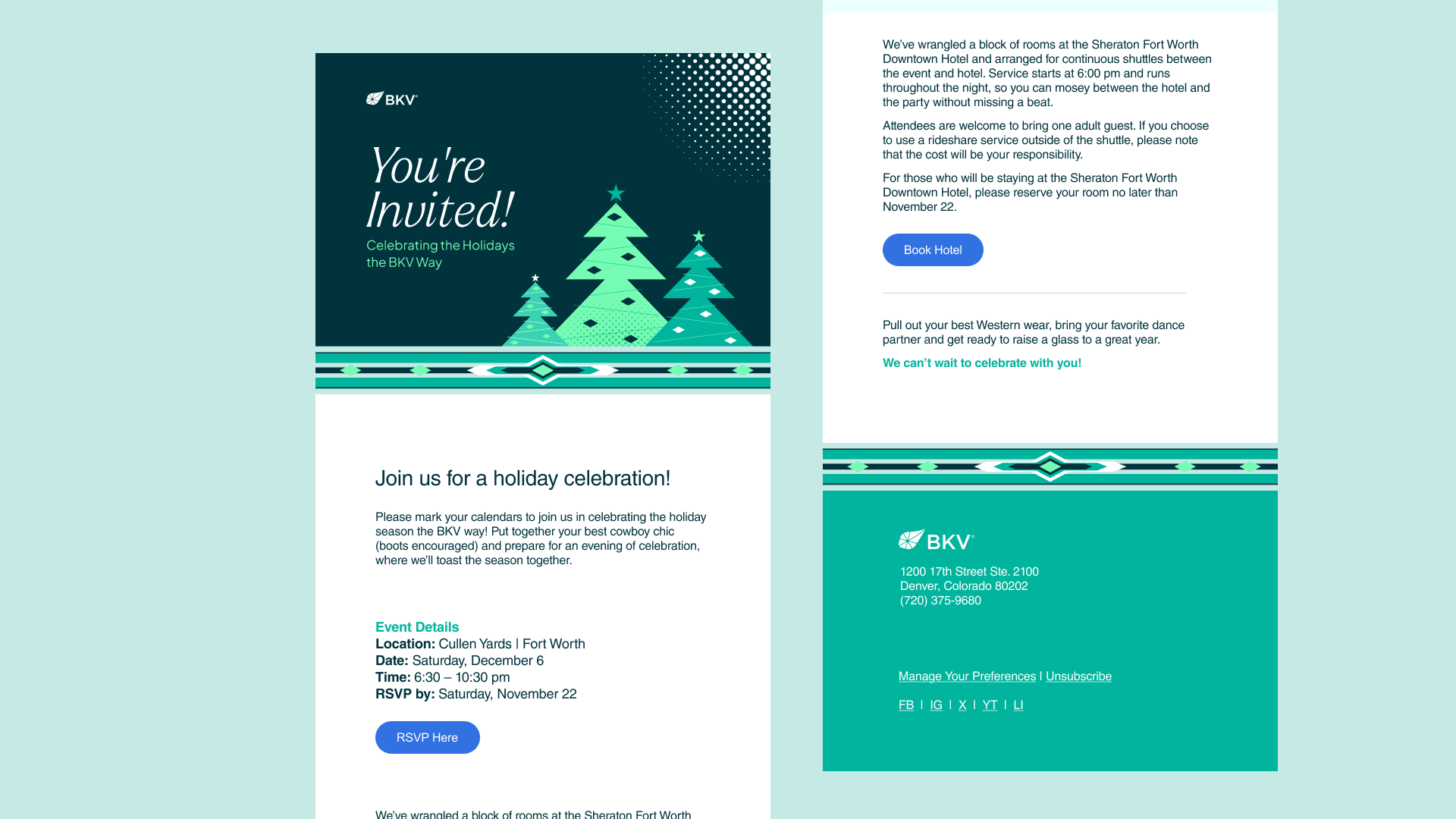 The 2025 holiday celebration took on a "cowboy chic" theme, so the email invitations needed to match. The used design focuses on common southwestern geometry given a BKV color makeover.