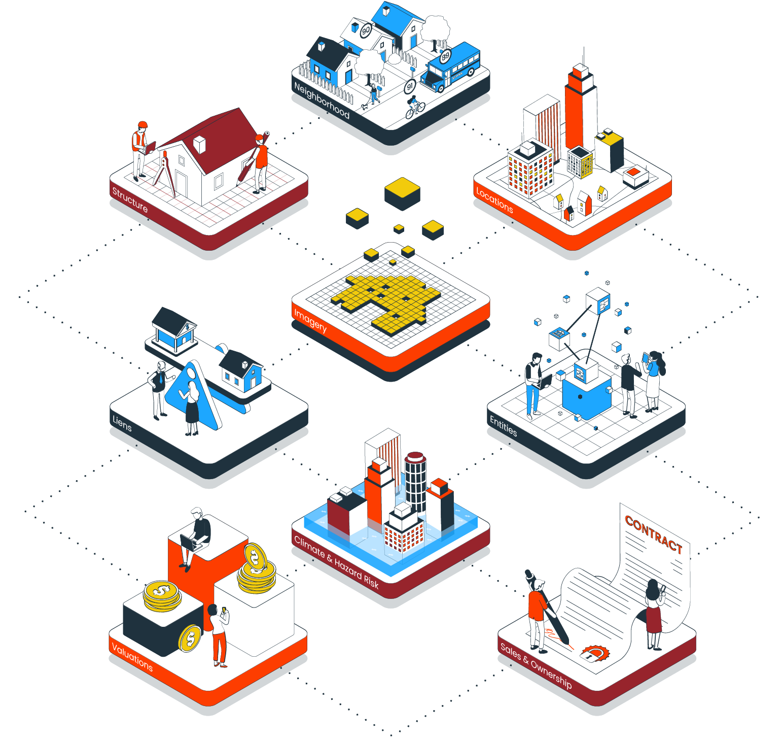 Isometric scenes that illustrate CoreLogic's property data offerings.