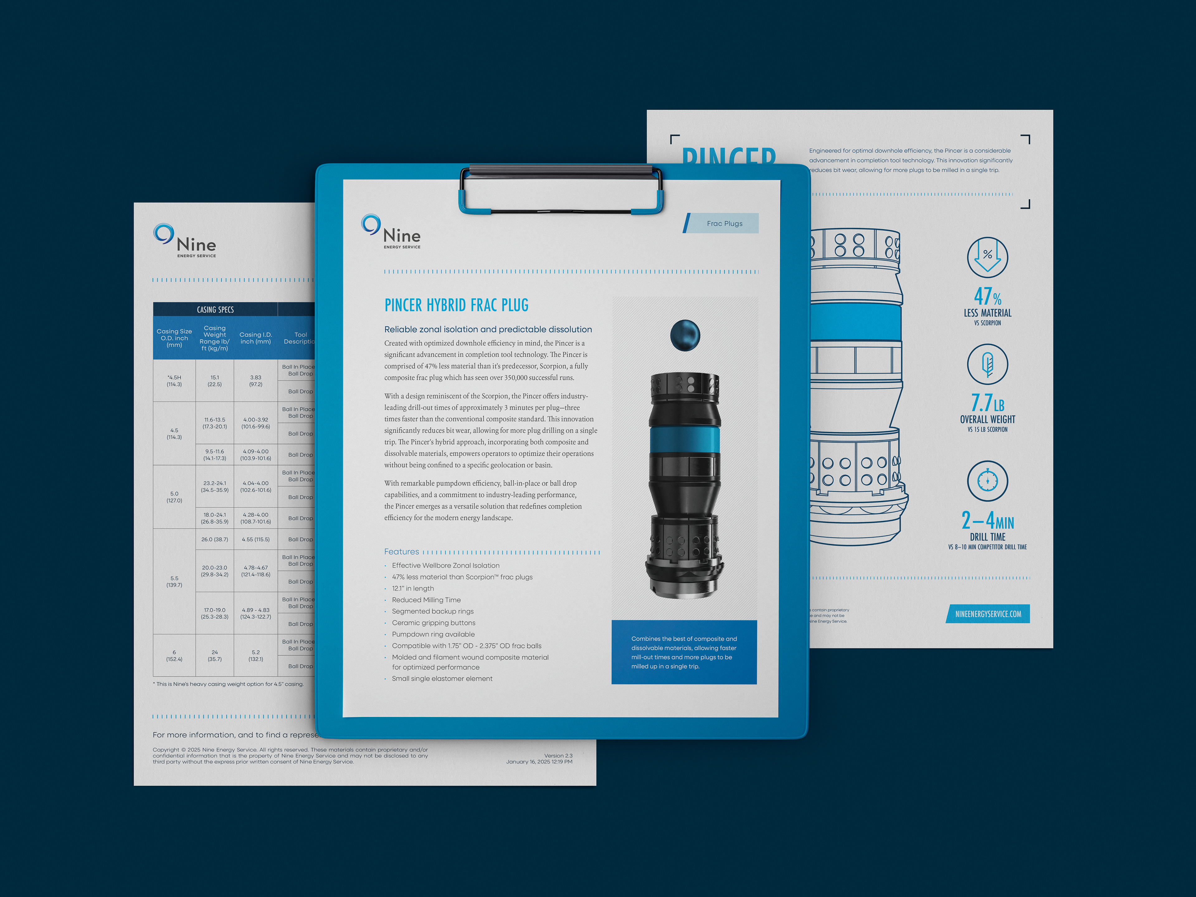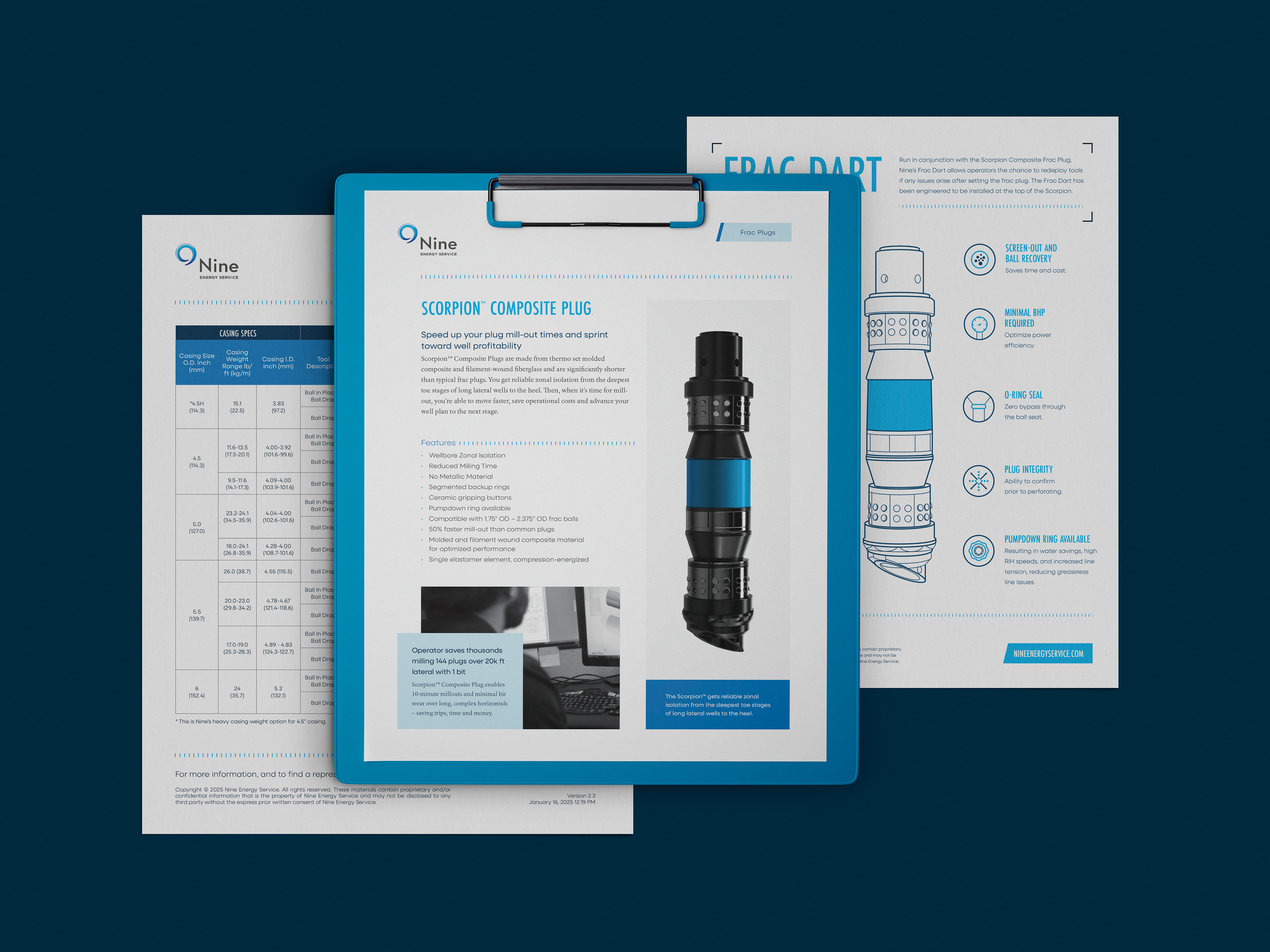 An updated layout design for Nine Energy Service's tech sheets alongside a technical infographic.