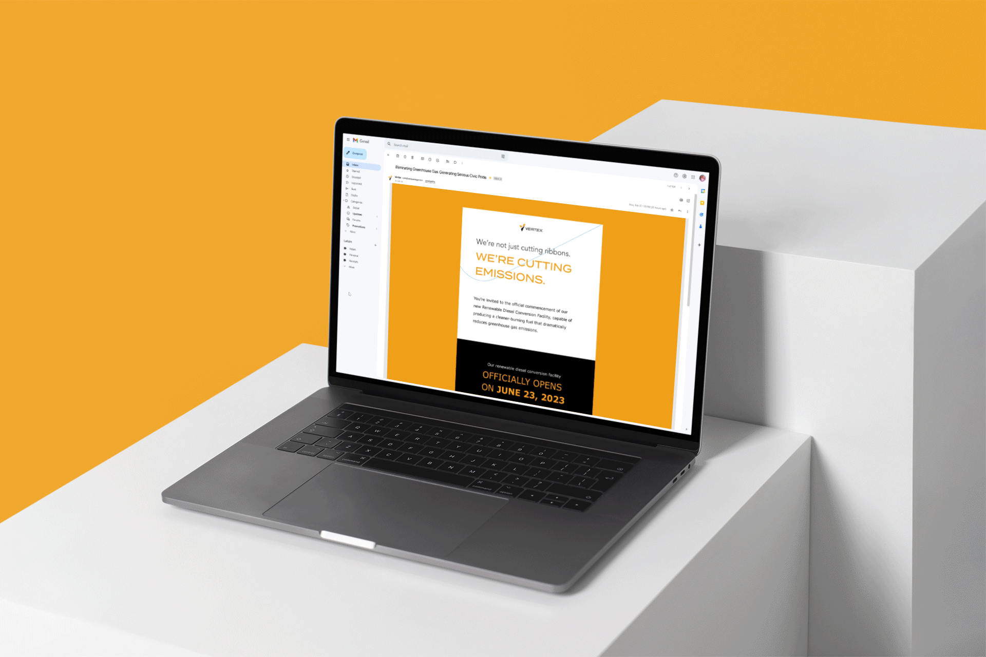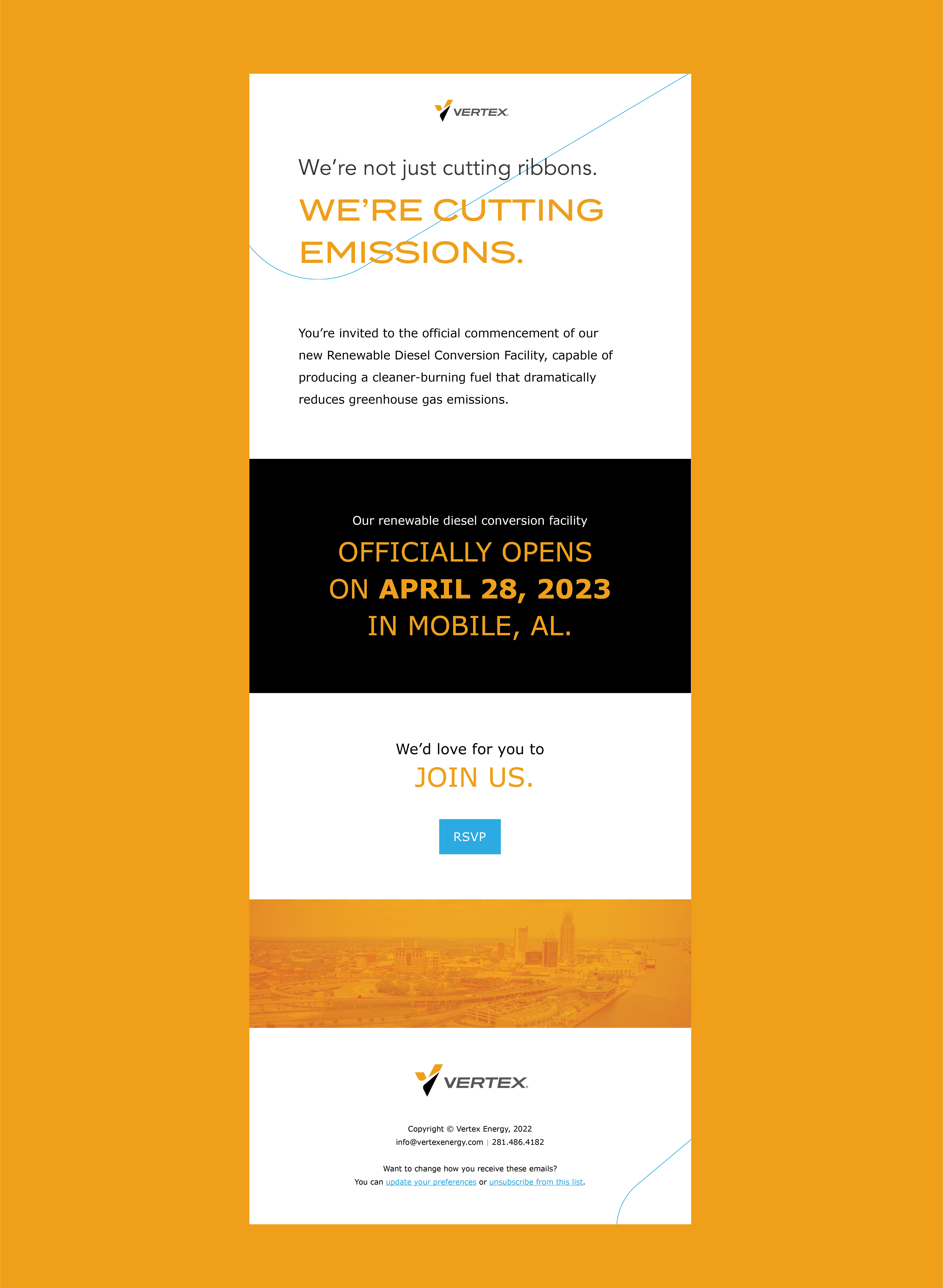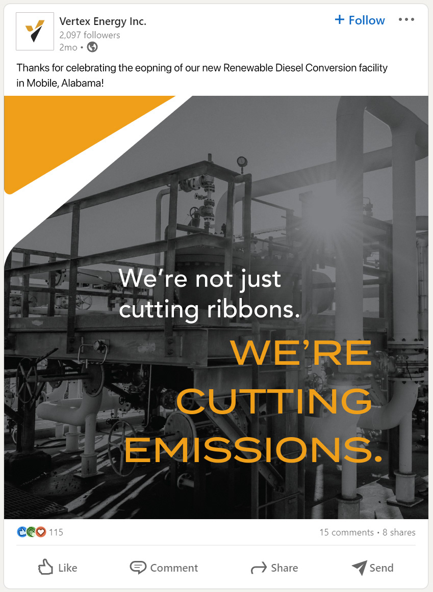 A suite of digital and print deliverables for Vertex's renewable diesel ribbon cutting event.